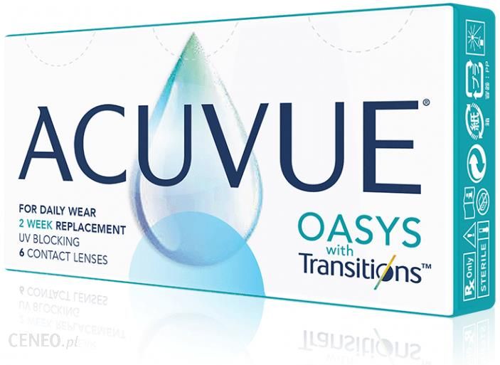 Soczewki kontaktowe Acuvue firmy Johnson & Johnson to innowacyjne produkty najwyższej jakości, wykonane w oparciu o nowoczesne technologie. Zostały zaprojektowane w trosce o zdrowie Twoich oczu, doskonałe widzenie i komfort. Soczewki kontaktowe z rodziny Acuvue są miękkie, cienkie i elastyczne. Wszystko to sprawia, że są one komfortowe już od pierwszych chwil noszenia i zapewniają dostęp tlenu do oczu na poziomie pozwalającym utrzymać nawilżone i zdrowe oczy. Soczewka ACUVUE OASYS with Transitions to pierwsza na świecie światłoczuła soczewka kontaktowa. To zupełnie coś innego niż Transitions znane z okularów. Działa dzięki Light Intelligent Technology Soczewka ACUVUE OASYS with Transitions zmienia zabarwienie w zależności od rodzaju światła oraz stopnia jego intensywności i jasności: redukuje negatywne, rażące światło filtrując je filtruje negatywne światło nawet, gdy jest przezroczysta, niezabarwiona działa na zewnątrz, jak i wewnątrz działa w dzień i w nocy.