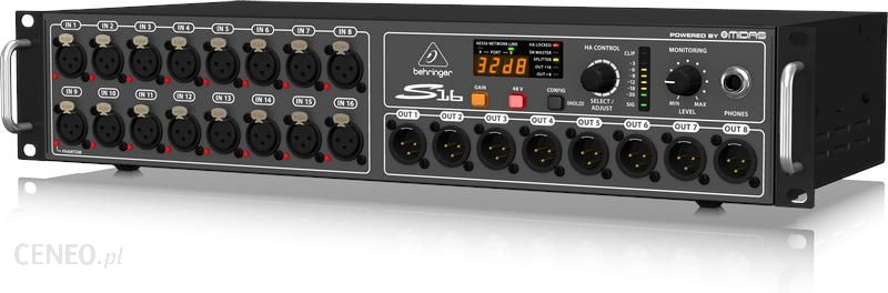 Stage Box DIGITAL SNAKE S16Stage Box z 16 zdalnie sterowanymi wejściami mic/line, 8 wyjściami i protokołem AES50 firmy KLARK TEKNIK.Port sieci AES50 wspierający technologię SuperMac firmy KLARK TEKNIK™.16 najwyższej klasy, w pełni programowalnych, zdalnie sterowanych przedwzmacniaczy mikrofonowych.8 analogowych zbalansowanych wyjść XLRUltra-niska latencjaKompatybilny z dousznymi systemami odsłuchuMożliwość tworzenia poprzez kabel CAT-5e połączeń na odległość do 100 m (brak w zestawie)Drugi port AES50 umożliwiający kaskadowe łączenie jednostek S16 bez użycia routera.Precyzyjny, 7-mio segmentowy wskaźnik LED umożliwiający monitoring sygnału wejściowego na scenie.Monitoring sceny poprzez wyjście słuchawkowe umożliwiające odsłuch każdego z kanałów wejściowych oraz wyjściowychMożliwość połączenia z systemem monitoringu personalnego BEHRINGER P-16 (brak w zestawie)Dwa wyjścia ADAT umożliwiający użycie S16 w roli splitera oraz jako samodzielnej aplikacji cyfrowego multicore’aWejście/Wyjście MIDI dla dwukierunkowej komunikacji pomiędzy konsoletą FOH oraz urządzeniami MIDI na scenieZłącze USB ułatwiające aktualizację oprogramowania systemowegoPrzełączalny zasilacz “Planet Earth” gwarantujący brak zakłóceń, świetną odpowiedź przejściową oraz niskie zapotrzebowanie na energię.Maksymalna elastyczności w zakresie 100 – 240 V“Zbudowany jak czołg” wciąż kompaktowy, całkowicie stalowe uchwyty montażowe rack – 2U.Wysokiej jakości podzespoły i wytrzymała konstrukcja zapewniające długotrwałe użytkowanieOpracowany i zaprojektowany przez BEHRINGER Germany