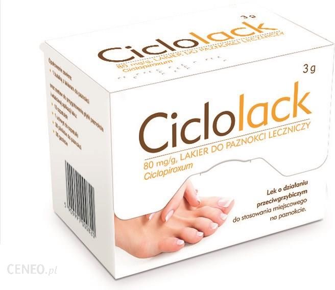 LAKIER LECZNICZY DO PAZNOKCICiclolack – lakier stosowany w leczeniu grzybicy paznokci – zawiera cyklopiroks, substancję aktywną o szerokim spektrum działania grzybostatycznego, grzybobójczego a także przeciwbakteryjnego.Opakowanie leku dodatkowo zawiera kompletny zestaw akcesoriów do prawidłowej i sterylnej aplikacji lakieru. Prawidłowe nakładanie lakieru warunkuje penetrację cyklopiroksu do płytki paznokcia i decyduje o skuteczności leczenia.