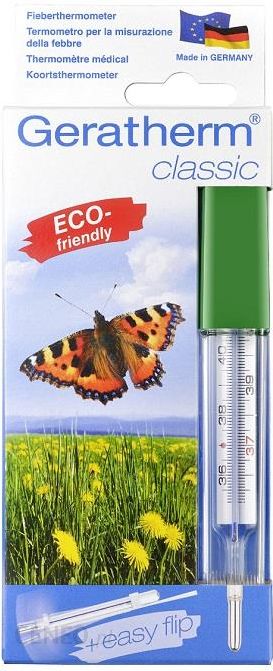 TermometrGERATHERM CLASSIC:szklany, analogowy, lekarski.Jedyny na świecie termometr bezrtęciowy, wypełniony galem.Jest bezpieczny dla zdrowia i środowiska, antyalergiczny.Możliwość 100 %-owej dezynfekcji.Patent światowy.Gwarancja wieczysta.ZAKRES POMIARU 34 C – 42C- 100% higieniczny.- 100% przyjazny dla środowiska -bez baterii- 100% antyalergiczny (bez niklu i PVC).