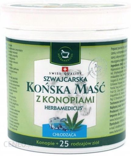 KosmetykKońska maść jest unikatowym balsamem ziołowym wyprodukowanym z 25 rodzajów ekstraktów ziołowych i roślinnych, sporządzonym według tradycyjnej receptury, sprawdzonej przez wiele pokoleń. Zrównoważony skład substancji czynnych zawartych w preparacie jest gwarancją szerokiego i skutecznego działania. Łączy w sobie kojący efekt zastosowania olejków eterycznych z pozytywnym wpływem wyciągów z ziół.Ekstrakty ziołowe zawarte w preparacie mogą przynieść ulgę w przypadku bólu stawów, mięśni, kręgosłupa oraz pomóc w dolegliwościach związanych z zapaleniami stawów, bólami reumatycznymi, stanami reumatycznymi, zapaleniami ścięgien, obrzękami stawów i przy dolegliwościach nerwu kulszowego. Zastosowane substancje aktywne zawarte w owocu i kwiecie kasztanowca zwyczajnego (zwanego końskim) są również sprawdzonym środkiem stosowanym w leczeniu żylaków.Balsam szybko wywołuje intensywne orzeźwienie oraz pobudza krążenie krwi, co powoduje zwiększenie skuteczności działania substancji aktywnych, a tym samym przyśpiesza rekonwalescencję. Przy produkcji preparatu wykorzystano wieloletnie doświadczenie ekspertów medycyny i kosmetyki naturalnej. Najwyższą jakość ekstraktów ziołowych i roślinnych oraz olejków eterycznych zawartych w preparacie gwarantują regularne testy i badania przeprowadzane przez producenta.Wskazania: w przypadku bólu stawów, mięśni, kręgosłupa oraz pomóc w dolegliwościach związanych z zapaleniami stawów, bólami reumatycznymi, stanami reumatycznymi, zapaleniami ścięgien, obrzękami stawów i przy dolegliwościach nerwu kulszowego.Sposób użycia: nanieść żel na chore miejsce w takiej ilości, aby skóra była zdolna go całkowicie wchłonąć. Następnie wmasować. Stosować na czystą skórę. Regularne stosowanie zwiększa skuteczność działania. W celu zwiększenia efektywności działania zaleca się zastosowanie grubszej warstwy balsamu i suchego opatrunku.Składniki aktywne: kasztanowiec zwyczajny, żywokost lekarski, jałowiec pospolity, arnika górska, rozmaryn lekarski, kamfora, eukaliptus gałkowy, mięta pieprzowa, sosna, miłorząb japoński, tarczyca bajkalska, jężówka purpurowa, rzepik pospolity, nagietek lekarski, tymianek, jodła pospolita, ekstrakt cytryny, ekstrakt grejpfruta, sosna górska – kosówka właściwa, lawenda lekarska, wrzos zwyczajny, porzeczka czarna, rumianek pospolity, borówka czernica, rdest wężownik.Produkt tylko do użytku zewnętrznego. Nie stosować w okolicy oczu, błon śluzowych oraz na podrażnioną skórę. Nie stosować u dzieci poniżej 3. lat. W przypadku występowania żylaków nie masować, a jedynie delikatnie wklepać balsam.