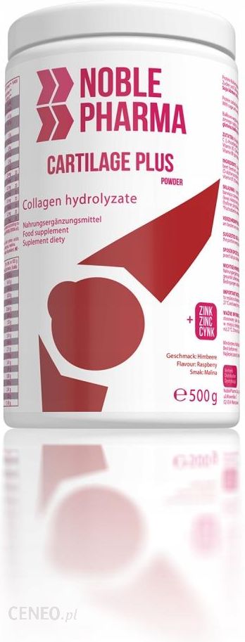Hydrolizat kolagenu w proszku z witaminami.Noble Pharma Cartilage Plus jest doskonały dla osób zmagających się z problemami kości i stawów. Może być stosowany także w stanach obciążenia stawów oraz tkanek miękkich pojawiających się przy intensywnym wysiłku fizycznym, w pracy przy powtarzających się ruchach lub zupełnie odwrotnie, po dłuższym okresie bezruchu spowodowanym niedyspozycją zdrowotną.Składniki preparatu dostarczają wysokowartościowego hydrolizatu kolagenu, aż 2400mg w jednej porcji (4g).Noble Pharma Cartilage Plus zawiera pełen profil wolnych aminokwasów, w tym rozgałęzione aminokwasy egzogenne, które należy dostarczać wraz z pożywieniem lub dodatkową suplementacją, ponieważ organizm człowieka nie posiada zdolności ich syntezy.Noble Pharma Cartilage Plus zawiera ponadto 9 witamin, w tym witaminę C oraz witaminy z grupy B.Zastosowanie: uzupełnienie diety w składniki preparatu.Zalecane spożycie: 4g proszku (1 miarka) należy wymieszać w 100ml wody. Najlepiej przyjmować porcję przed lub po śniadaniu.Składniki: hydrolizat kolagenu¹ (60%), fruktoza (31,5%), substancja zakwaszająca (kwas cytrynowy), aromat (zawiera laktozę, gluten), koloryzujący proszek spożywczy z barwiących buraków (betanina), kwas L-askorbinowy, substancje słodzące (cyklaminian sodu, acesulfam K, sacharyna), octan D-alfa-tokoferylu (zawiera soję), amid kwas nikotynowego, D-pantotenian wapnia, chlorowodorek pirydoksyny, monoazotan tiaminy, kwas pteroilomonoglutaminowy, D-biotyna, cyjanokobalamina*.4g zawiera: hydrolizat kolagenu 2,4g; witamina C 16mg (20%*); witamina E 2,4mg (20%*); witamina B 0,22mg (20%*); niacyna 3,2mg (20%*); witamina 0,28mg (20%*); kwas foliowy 40μg (20%*); kwas pantotenowy 1,2mg (20%*); biotyna 10μg (20%*); witamina B 0,5μg (20%*).¹pochodzenie wołowina.*RWS – referencyjna wartość spożycia.Ważne wskazówki:Nie należy przekraczać zalecanej dziennej porcji.Suplement diety nie może być stosowany jako substytut zróżnicowanej diety oraz zdrowego stylu życia.Produkt zawiera źródło fenyloalaniny.Zawiera cukier i substancje słodzące.Produkt należy przechowywać w suchym miejscu, najlepiej w temperaturze do 21°C.Chronić produkt przed ekspozycją na światło słoneczne.Produkt należy przechowywać w miejscu niedostępnym dla dzieci.Może zawierać śladowe ilości glutenu, białka jaj kurzych oraz soję.Dystrybutor:NoblePharmaul. Wawelska 502-034 Warszawa