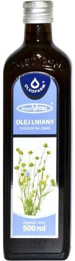 Olej lniany charakteryzuje się wysoką zawartością tłuszczów nienasyconych, w tym wielonienasyconych kwasów tłuszczowych, do których należą kwasy omega-3 i omega-6. Zastępowanie w diecie tłuszczów nasyconych tłuszczami nienasyconymi pomaga w utrzymaniu prawidłowego poziomu cholesterolu we krwi (jedno- i wielonienasycone kwasy tłuszczowe są tłuszczami nienasyconymi). Olej lniany może być spożywany przez dzieci.Zastosowanie: dodatek do sałatek, surówek, dipów, sosów, past serowych, gotowanych warzyw i innych potraw na zimno. Sposób użycia: olej powinien być stosowany wyłącznie na zimno. Nie nalezy podgrzewać, ani smażyć na nim potraw.Składniki: olej lniany tłoczony na zimno, przeciwutleniacz: mieszanina tokoferoli.100ml oleju zawiera:- wartość energetyczna (energia): 3400kJ /827kcal,- tłuszcz 92g, w tym: kwasy tłuszczowe nasycone 9,9g, kwasy tłuszczowe jednonienasycone 16g, kwasy tłuszczowe wielonienasycone 66g, omega-3 (kwas alfa-linolenowy) 2,6g, omega-6 (kwas linolowy) 63g; węglowodany 0g, w tym cukry 0g; błonnik 0g; białko 0g; sól 0g.Ważne wskazówki:Partie oleju lnianego mogą się różnić od siebie smakiem, zapachem i kolorem (dopuszczalny jest np. posmak ziołowy, goryczkowy, itp.), co nie wpływa na jakość oleju.Może wytrącić się naturalny osad.Przed użyciem wstrząsnąć.Przechowywać w temp. pokojowej, w suchym i ciemnym miejscu.Masa netto: 500ml.Kraj pochodzenia: Polska.Producent:Oleofarm Sp. z o.o.Ul. Mokronoska 8,52-407 Wrocław.
