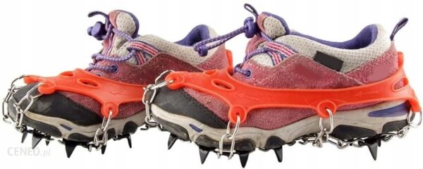 RAKI NA BUTY ANTYPOŚLIZGOWEElastyczne, antypoślizgowe nakładki na buty z kolcami. Raki to niezbędnik każdego podróżnika wyruszającego na wyprawę w góry.Zapewniają zwiększoną przyczepność do podłoża, i uniemożliwiają ślizganie się podeszwy na oblodzeniach, czy śniegu.Raki posiadają 8 zębów ze stali hartowanej, które zostały równomiernie rozmieszczona na powierzchni podeszwy. Całość jest łączona łańcuchem ze stali nierdzewnej, dzięki czemu posłużą nam przez długi czas.Elastyczny silikon jest odporny na niskie temperatury. Umożliwia wygodne naciągnięcie raków na każdy rodzaj obuwia.Nakładki zapakowane w wygodny woreczek, ułatwiający ich transport.