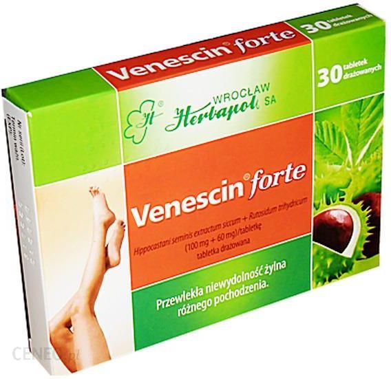 Venescin Forte 30 tabl.Venescin Forte to lek przeznaczony dla osób dorosłych, który stosuje się w przewlekłej niewydolności żylnej różnego pochodzenia, objawiającej się obrzękami, skurczami łydek, świądem, bólem, uczuciem ciężkości w nogach oraz pod kontrolą lekarza w żylakowatości (żylakach). Vanescin Forte zawiera:wyciąg suchy z nasion kasztanowca zwyczajnego – posiada właściwości przeciwobrzękowe, a także zwiększa tonus żył,rutozyd (rutyna) – zmniejsza przepuszczalność naczyń włosowatych i zwiększa ich odporność mechaniczną.
